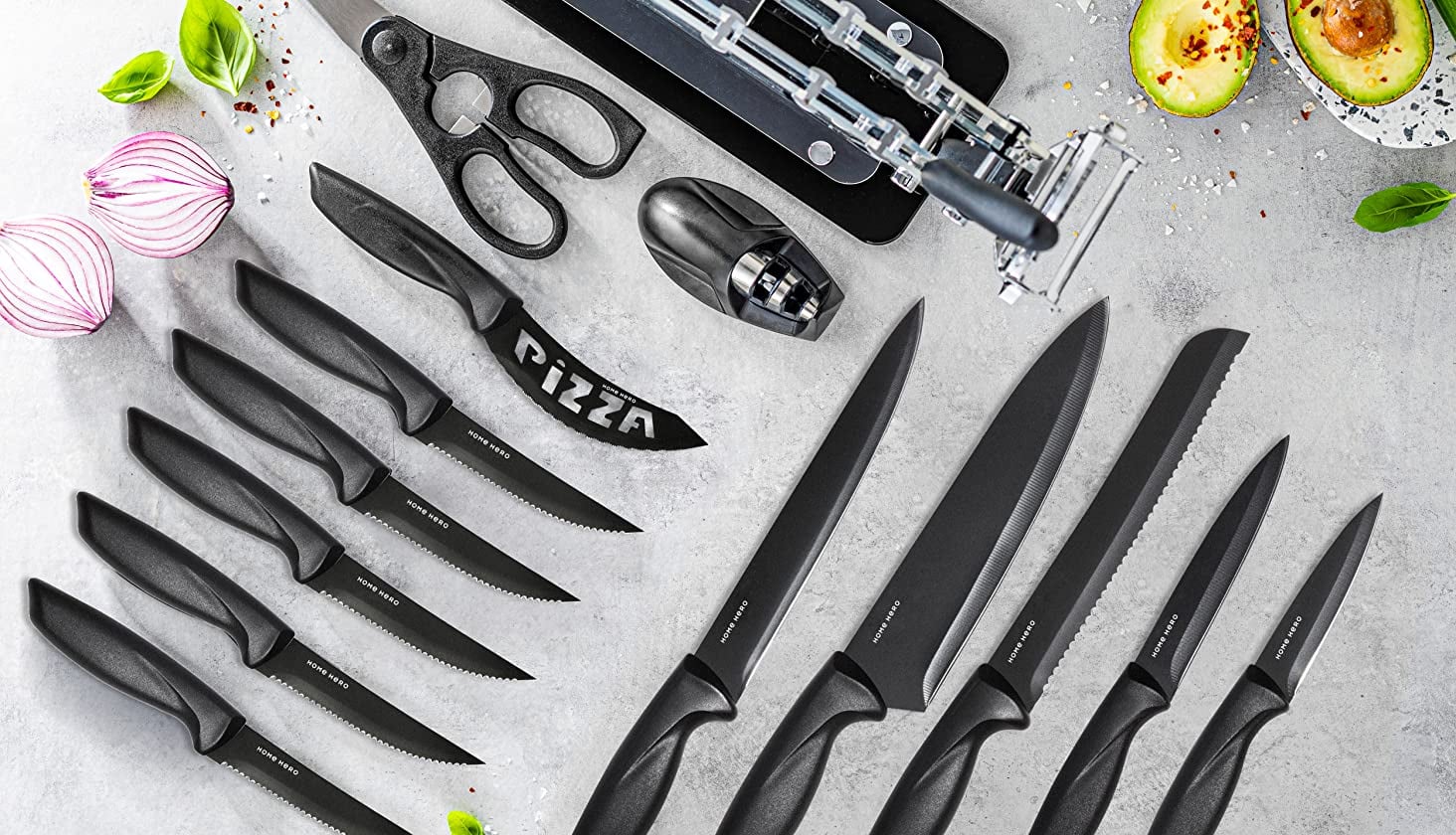 The chef knife comes with a twenty-one cm, really, really sharp blade and it cuts fruits, vegetables, and even chicken and meat effortlessly. It cuts the prep time in the kitchen – what a convenience!